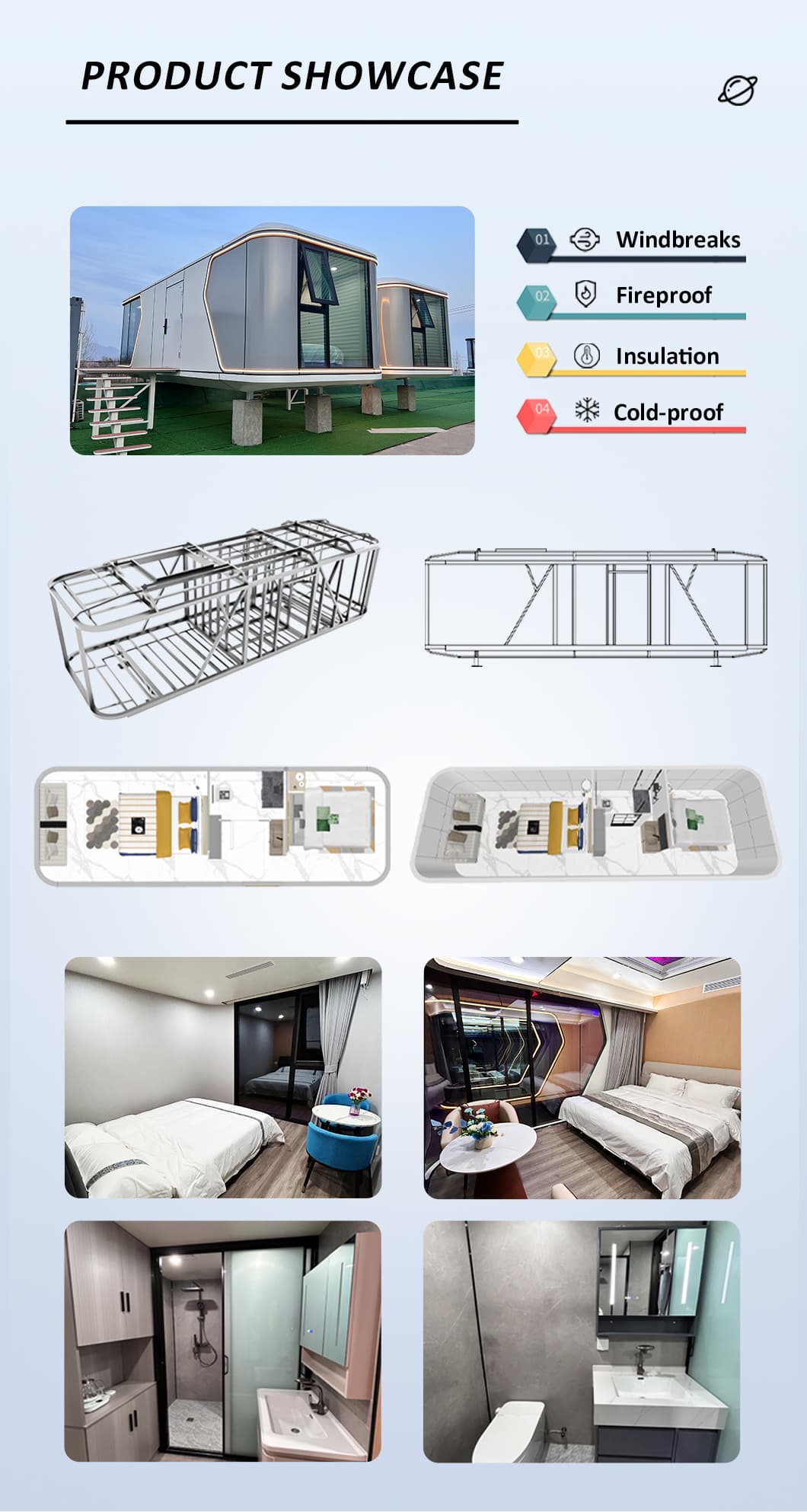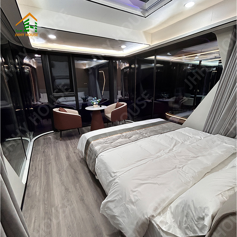 | système de décoration intérieure | Plafond suspendu (panneaux OSB + panneaux en fibre de carbone) Surface murale intérieure (panneau OSB + panneau en fibre de carbone) panneau + panneau en fibre de carbone) Revêtement de sol intérieur (revêtement de sol à verrouillage SPc) systèmes de chauffage au sol Porte de salle de bain (porte coulissante en verre préservant l'intimité) Lavabo (marbre sur mesure) Murs de salle de bain (panneau de verrouillage SPC) sol de salle de bain (carrelage) Meubles tels que lits, tables de chevet, canapés, etc. (personnalisables) |