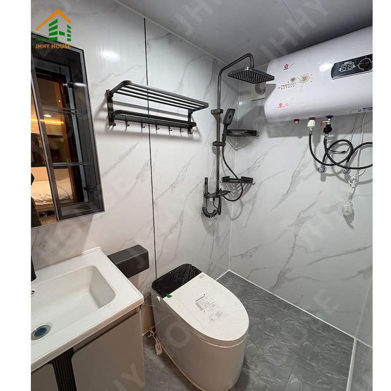 Suspended ceiling (OSB board+carbon fiber board) Interior wall surface(OSB board+carbon fiber board) board+carbon fiber board)Indoor flooring (SPc lock flooring) Underfloor heating systems Bathroom door(privacy sliding glass door) Washbasin (marble customized) Bathroom walls (SPC lock board) Bathroom floor (tiles) Furniture such as beds, nightstands, sofas, etc. (can be customized) |