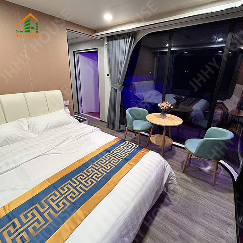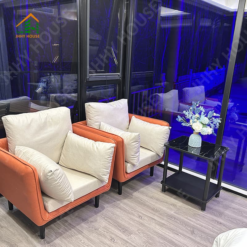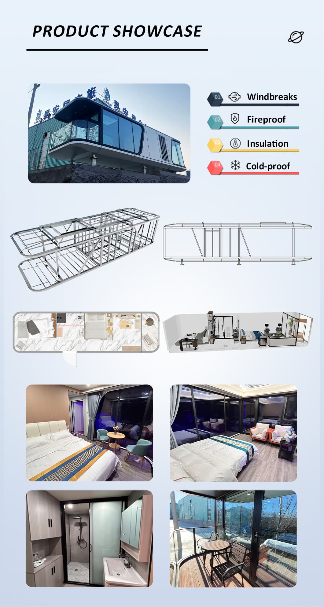 | système de décoration intérieure | Plafond suspendu (panneaux OSB + panneaux en fibre de carbone) Surface murale intérieure (panneau OSB + panneau en fibre de carbone) panneau + panneau en fibre de carbone) Revêtement de sol intérieur (revêtement de sol à verrouillage SPc) systèmes de chauffage au sol Porte de salle de bain (porte coulissante en verre préservant l'intimité) Lavabo (marbre sur mesure) Murs de salle de bain (panneau de verrouillage SPC) sol de salle de bain (carrelage) Meubles tels que lits, tables de chevet, canapés, etc. (personnalisables) |