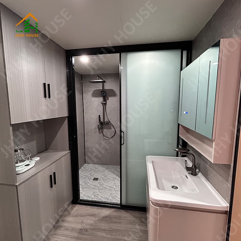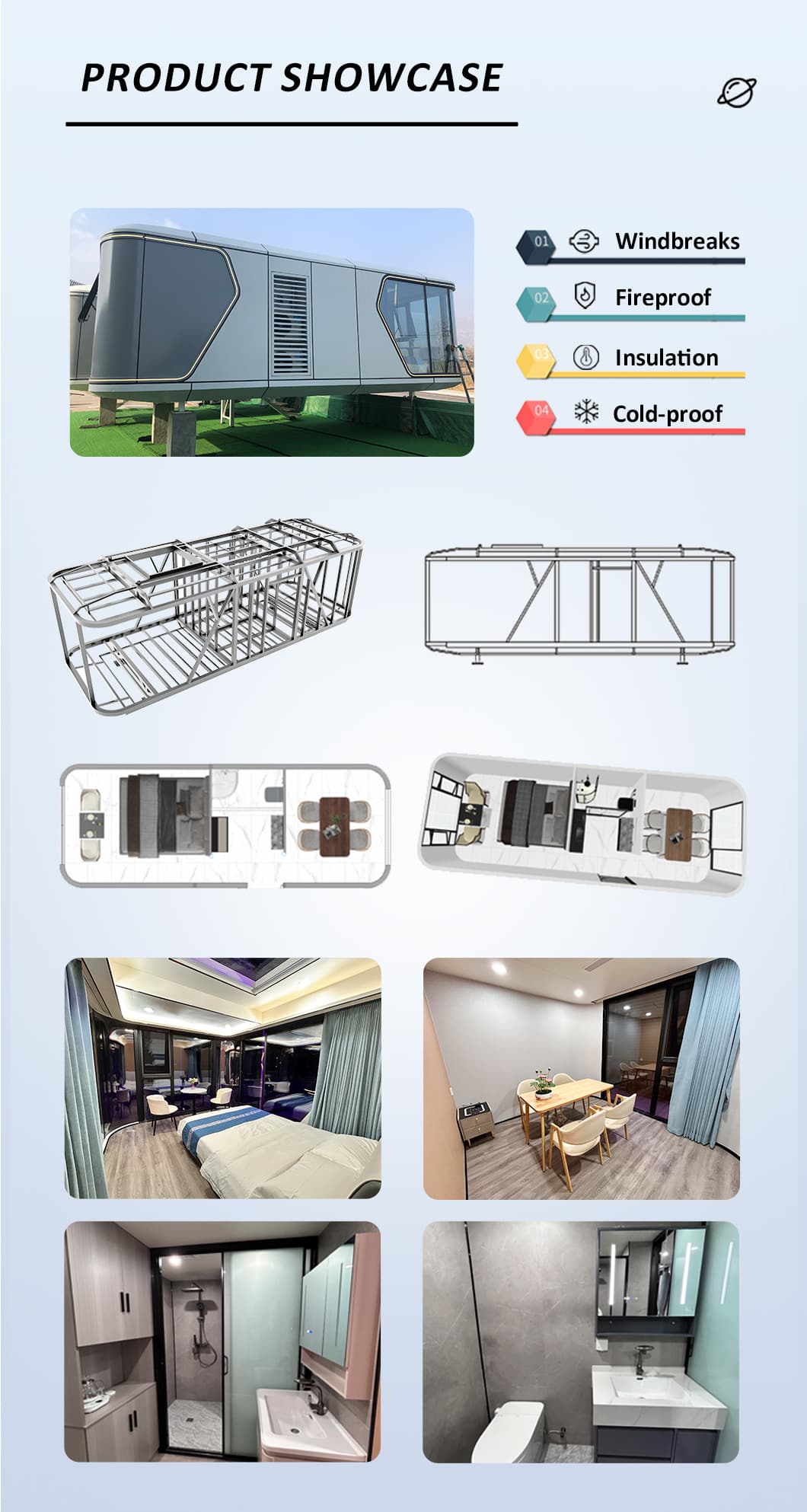 | système de décoration intérieure | Plafond suspendu (panneaux OSB + panneaux en fibre de carbone) Surface murale intérieure (panneau OSB + panneau en fibre de carbone) panneau + panneau en fibre de carbone) Revêtement de sol intérieur (revêtement de sol à verrouillage SPc) systèmes de chauffage au sol Porte de salle de bain (porte coulissante en verre préservant l'intimité) Lavabo (marbre sur mesure) Murs de salle de bain (panneau de verrouillage SPC) sol de salle de bain (carrelage) Meubles tels que lits, tables de chevet, canapés, etc. (personnalisables) |